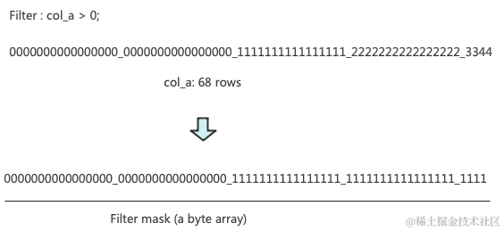 首先对根据过滤条件给一个Chunk的数据生成一个Filter Mask,Filter Mask是一个行数等于Chunk大小的UInt8数组,数组中只有2个值,其中0表示该行的数据不符合过滤条件,1表示符合。