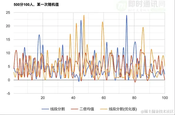 **如上图所示:**线段分割算法与二倍均值相比,随机区间更大。