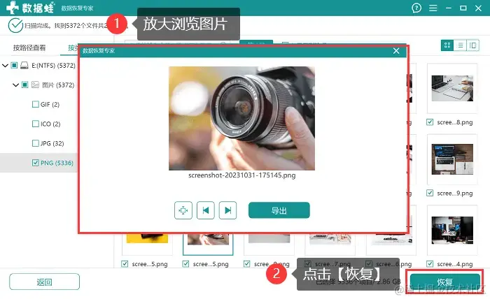 步骤4:若不确定照片是否需要恢复,可以放大图片浏览,确定需要恢复后,点击 【恢复】,并选择与图片保存位置不一致的地方保存恢复后的图片。