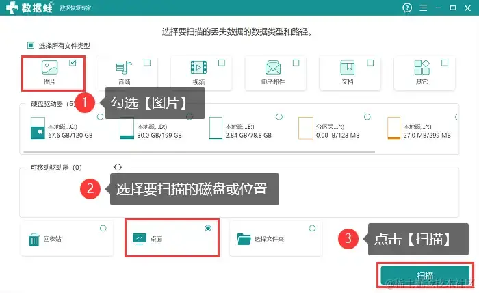 步骤1:安装好软件后,新用户可先选择 【免费试用】 ,在主界面上,勾选【图片】,并选择要扫描的磁盘或位置,点击【扫描】 ;