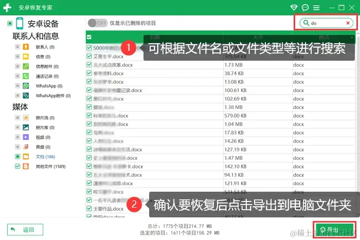 步骤3:用户可以根据关键词,如文件名、文件类型等进行搜索筛选,确认要恢复之后选中这些项目,点击 【导出】 ,就能够将文件下载到指定的文件夹中。