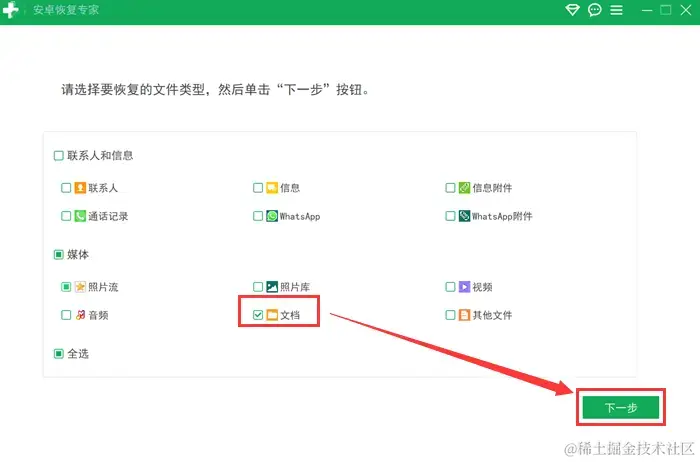 步骤2:连接完成后,我们可以在电脑界面上选择可恢复的文件类型,然后单击 【下一步】 ,就可以开启扫描,它将深度挖掘出可恢复的文档,不过这个过程需要一些时间,请耐心等待。