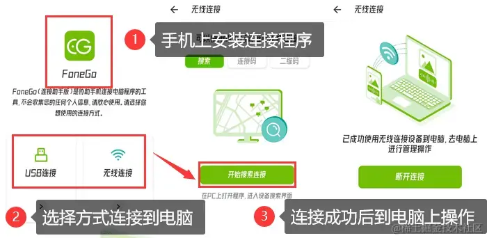 步骤1:在手机和电脑上安装,然后选择合适的连接方式,将两个设备连接起来,并授予一定的权限,使它能够顺利检测到设备。