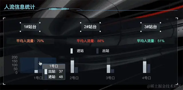HT 平台内能够实时监测并呈现多个站台的平均人流量,并将人流量较高的站台以红色字体标注,人流量较少的站台以绿色字体标注。同时,针对车站人流数据的实时动态变化,选用双色柱状图直观地展示各地铁口的进站和出站情况。帮助管理者高效疏通人流,达到各站台调控管理目的。