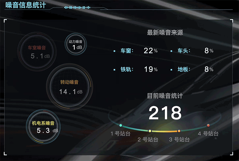 平台通过接入物联监测元件,将获取到的数据与二维场景进行联动,可实时显示机电设备、铁轨、通信设备等关键部位的分贝参数和来源统计。 当这些参数超出正常范围时,系统会自动触发告警,定位至异常区域, 并输出指数超标信息。