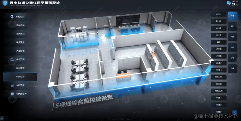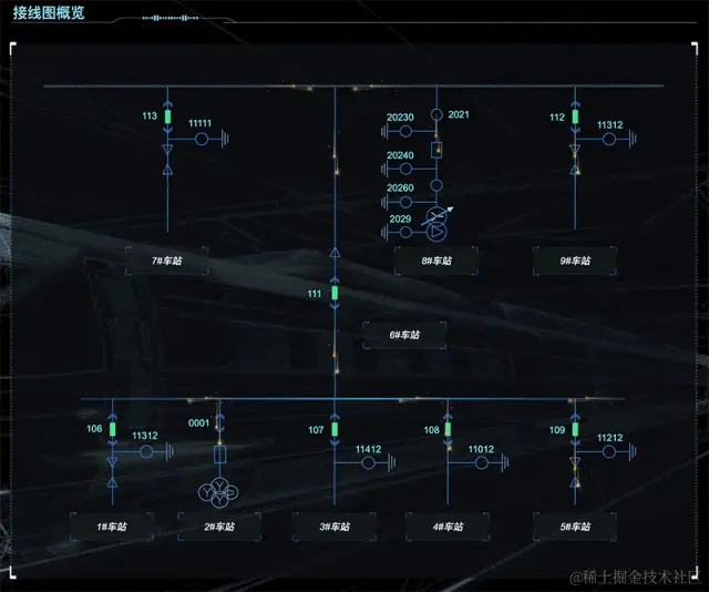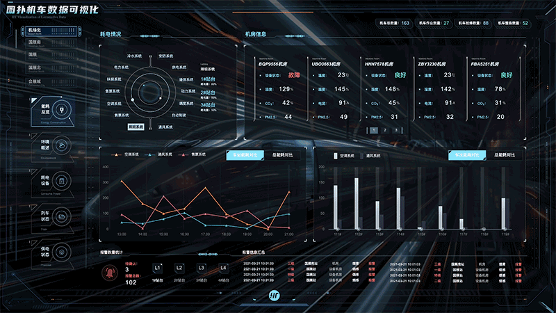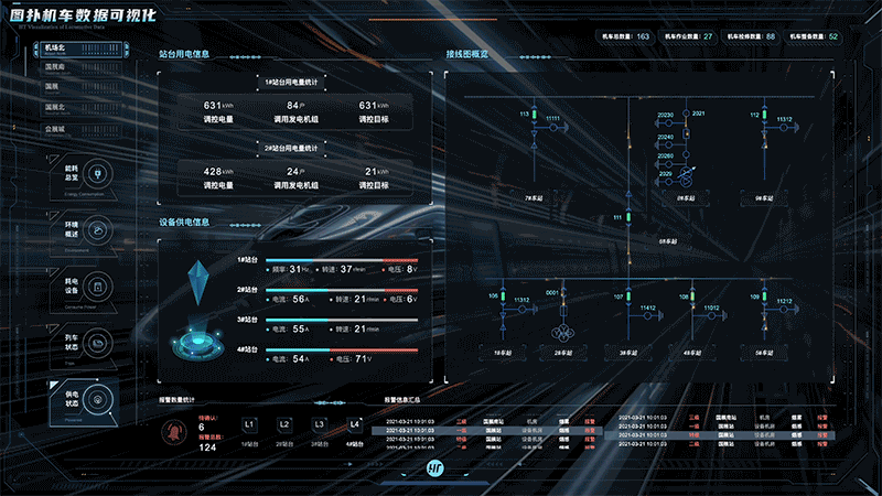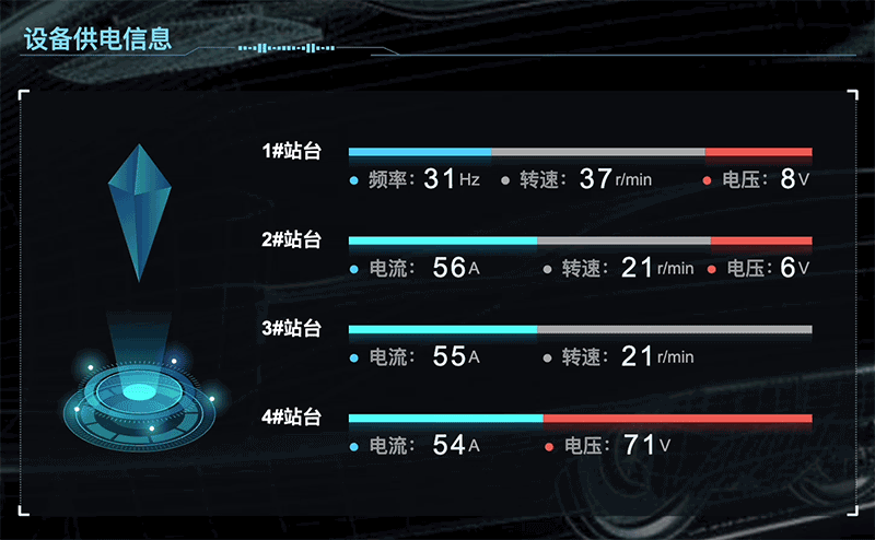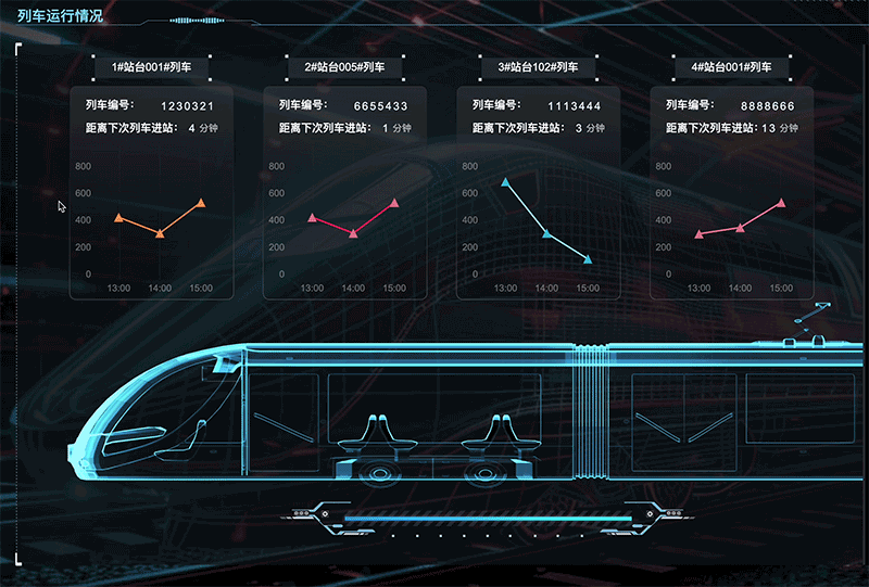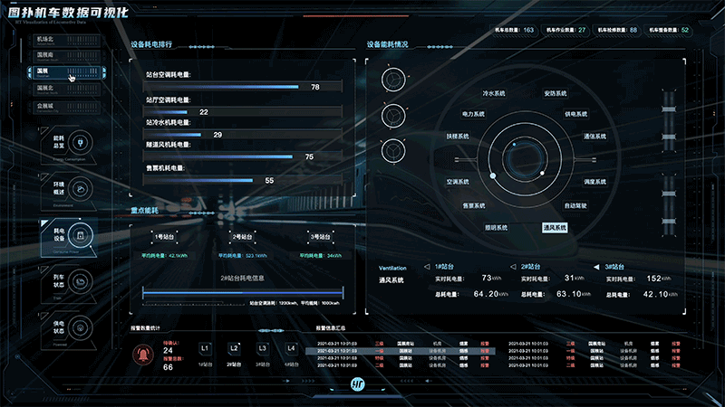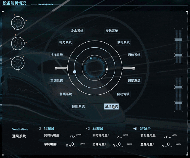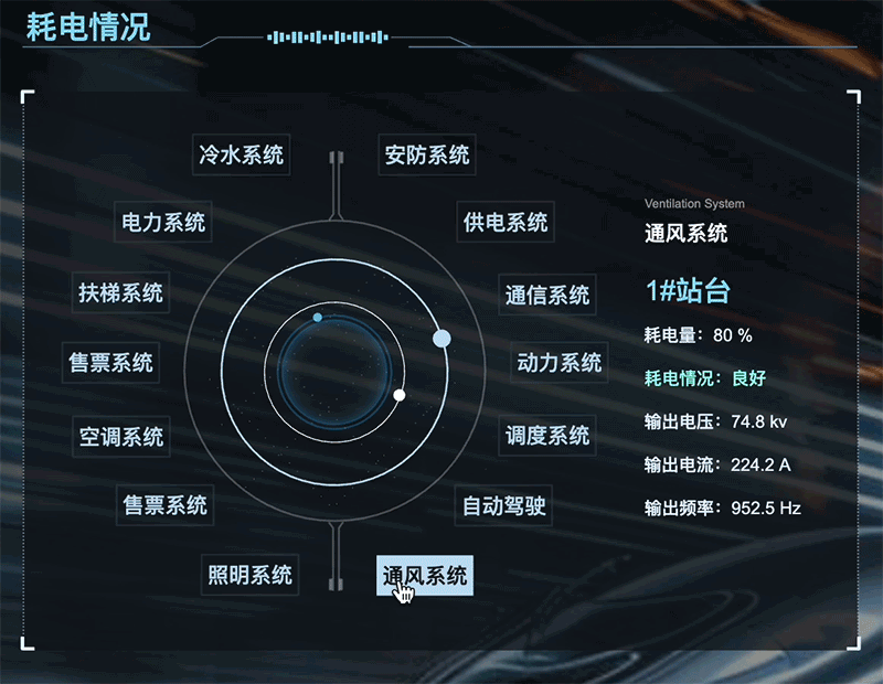 通过对站台和设备设立多个监测点,收集关于站台用电、设备供电的实时数据,应用图扑 HT 数据可视化多样化图表、图形、设计元素,将各车站目标因素运行数据进行图形化和可视化。