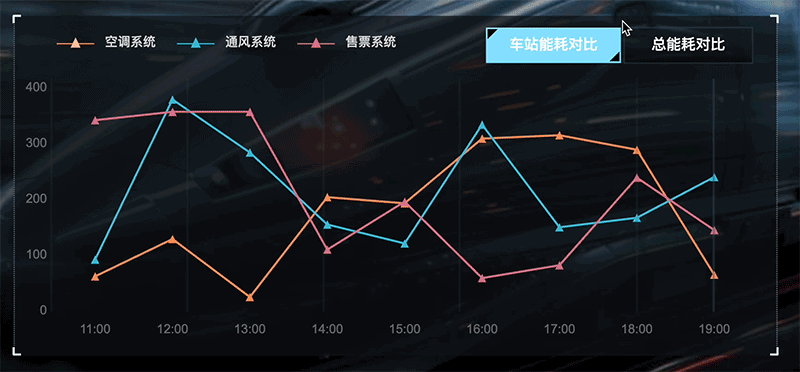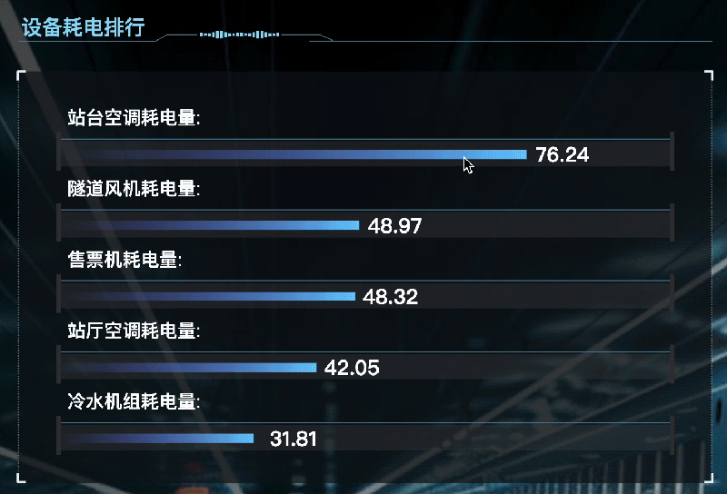 通过构建一个综合的数据可视化仪表盘,对各站台照明系统、通风系统、冷水系统等能耗设备的电力和总耗电量进行数据对比监控。点击相关设备,下方将显示每个站台该设备的实时耗电量和总能耗等关键信息。为用户直观比较站台各系统能耗提供便捷。