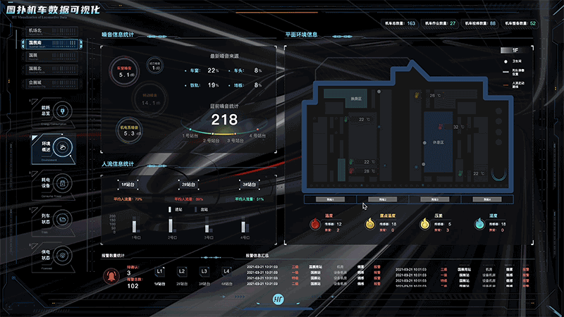 该板块含图扑丰富的 2D 图表组件,简洁清晰地展示近期各车站的噪音信息统计、平面环境信息以及人流信息统计。这种数据驱动的环境和人流信息展示,旨在让用户能够快速而深入地理解各车站的环境状况和人流动态,使环境监控和人流管理的决策过程更有针对性,更高效。