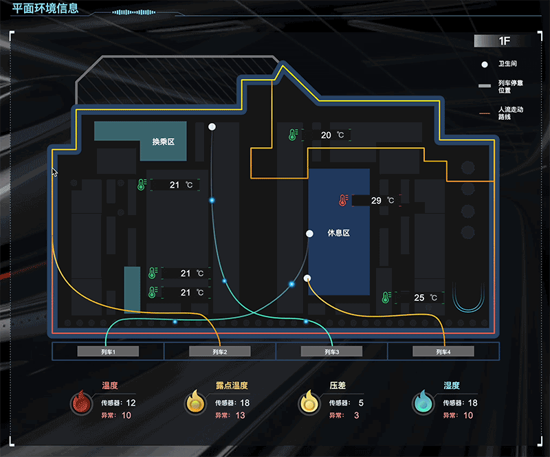 平面图能准确地传达车站的物理空间布局。 让管理人员能更精确地找到站台、车辆停靠位置和设施服务区域的具体位置,辅助增强他们的方位感和空间认知。 搭配显示车站内各区域的温度、露点温度、压差和湿度信息,使用户对车站的环境条件有全面的了解。