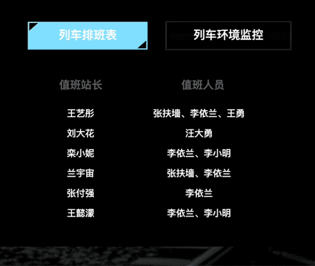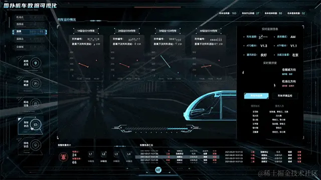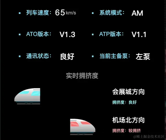 页面围绕“运行状态”、“承载状态”、”工作环境”三个主要方面进行展示。将底层数据接口获取到的列车拥挤程度,进行可视化动效展示(红色-拥挤,绿色-良好),辅助运营团队及时调整列车运行计划,如增加车次或使用更大容量的列车,以减轻特定时间段内的拥挤情况。搭配面板中详细释义的列车时速、通讯状态、系统模式等属性。以可视、互动、透明管理机制为前提,实现机车作业的实时追踪和安全预警, 有效避免车辆作业无序统计和危险事件无据可查的难题。