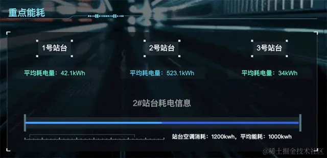 支持聚焦 1 号、2 号、3 号等主要站台的平均耗电量信息。对于收集到的站台能耗数据,进行 7*24 小时实时监测。用户通过面板底部数值变化快速识别哪些站台的能耗超出正常范围。另外,通过比较不同站台之间的能耗数据,可以发现节能潜力和改进空间。