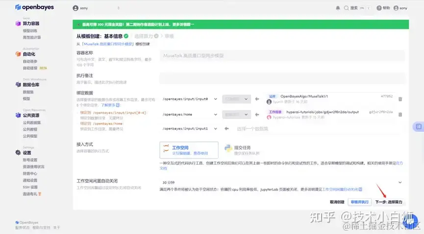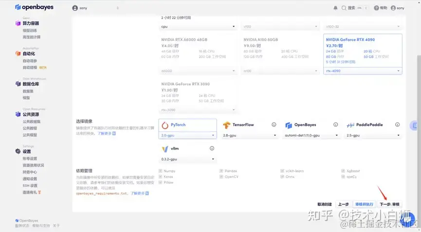进入该教程后,点击「克隆」-「下一步:选择算力」。页面跳转后,算力选择 RTX 4090,新用户别忘了使用我文章开头的邀请链接!选择 PyTorch 镜像后,点击「下一步:审核」。