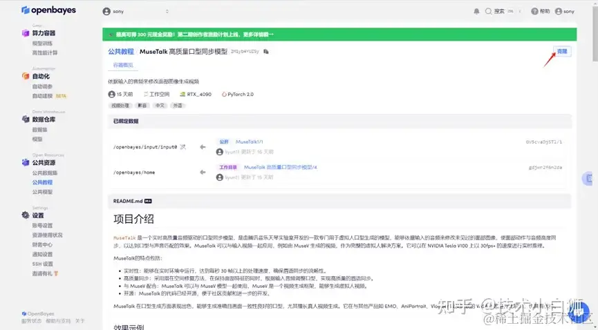 登录到 OpenBayes 平台后,点击「公共教程」,找到「MuseTalk 高质量口型同步模型」教程。