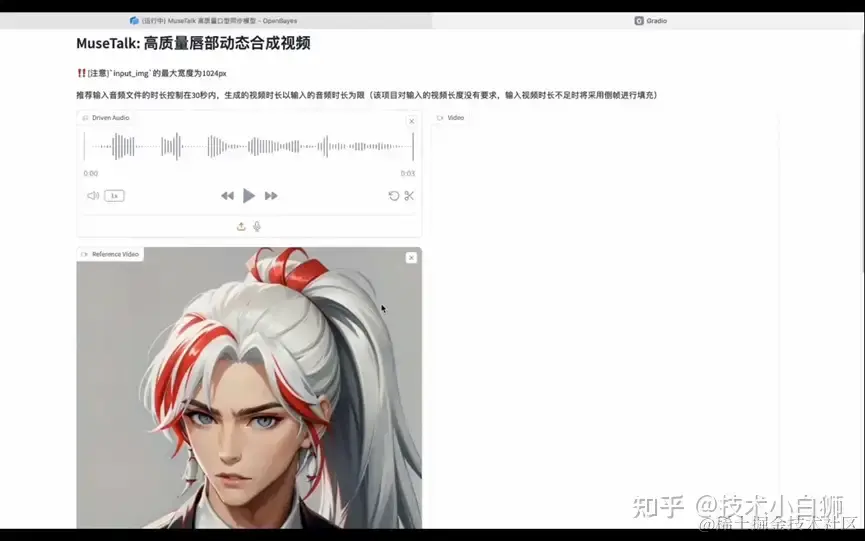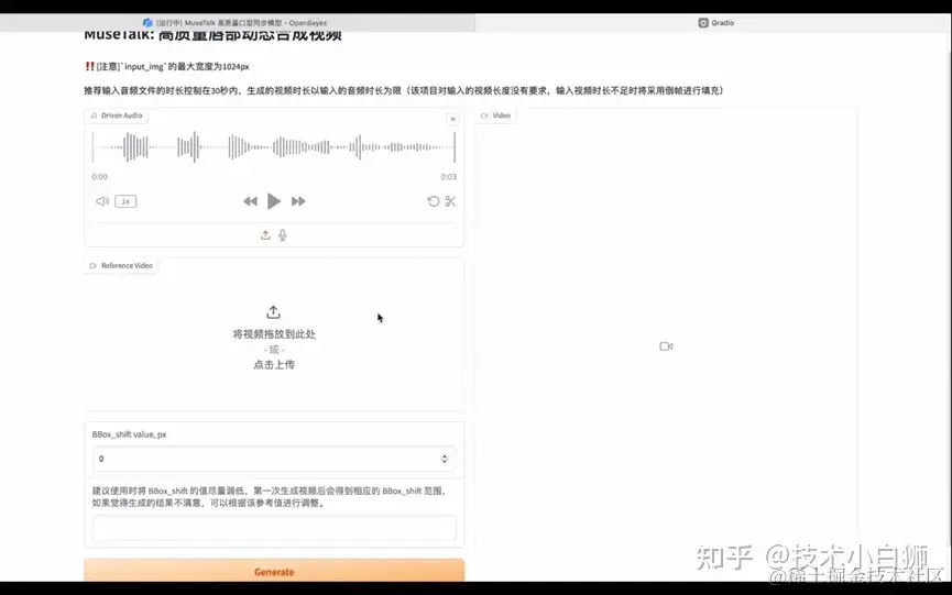 在项目展示页面中,在 Driven Audio 框内上传音频文件,第 Reference Video 框内输入视频文件,然后点击 Generate,稍等片刻即可生成视频。