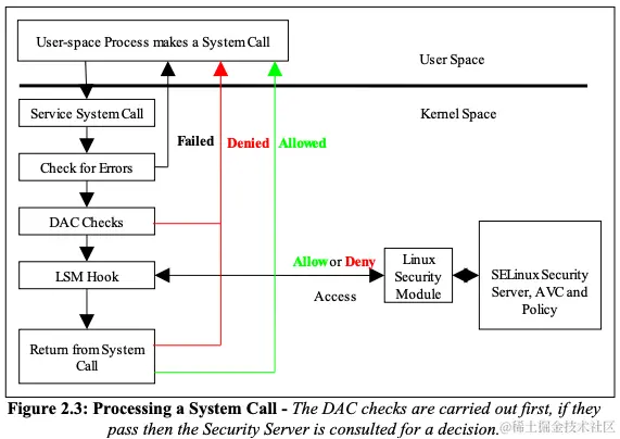 再之后便会进行 MAC 检查,在这里就是进行 SELinux 的检查,它会根据当前主体和客体的类型,查询策略,检查是否允许当前类型的主体访问客体,检查失败的话,则也是会得到类似 permission denied 的信息