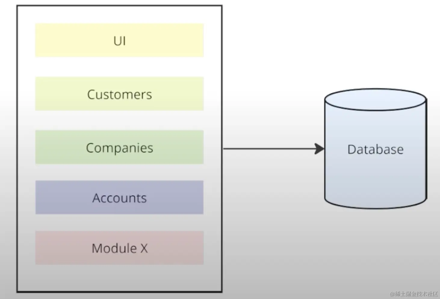 单体架构是集中式系统的一个典型代表。它通常表现为一个可部署和可执行的整体。例如,这种架构的组件可能包括一个用户界面以及位于同一位置的多个模块。