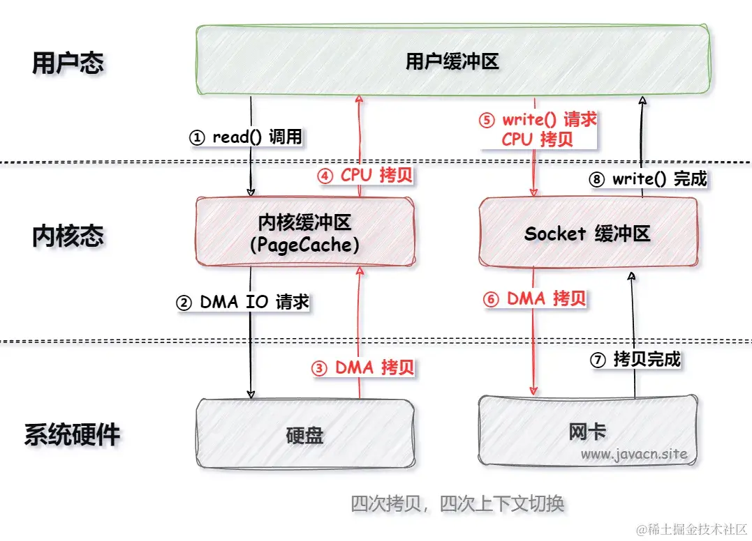 在传统的 IO 操作中,当我们需要读取并传输数据时,我们需要在用户态(用户空间)和内核态(内核空间)中进行数据拷贝,它的执行流程如下: