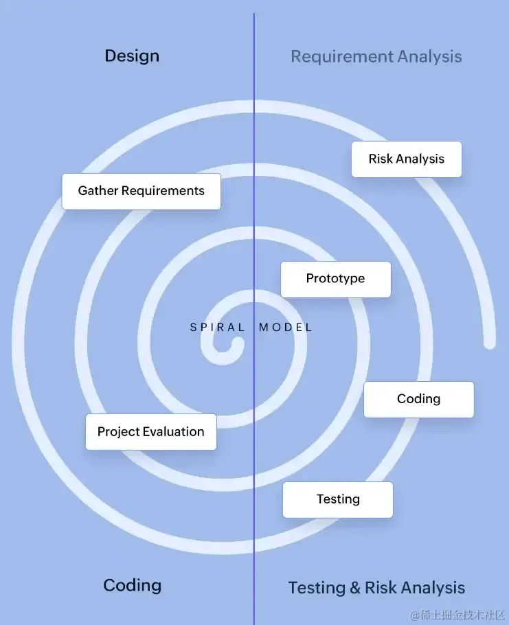 螺旋模型是一种高度规避风险的模型,是中高风险项目的首选模型。它大致分为四个阶段:目标识别、设计、开发和风险分析。在这个模型中,开发周期的每个阶段都呈螺旋状——基础螺旋侧重于基本要求,每重复一个周期,软件就愈加详细。例如,目标识别阶段的基础螺旋是利益相关者的高级要求集合,在下一个螺旋中,它将指向同一项目的技术要求。当预计最终产品在构建流程中需要大量更改时,此模型比较合适。