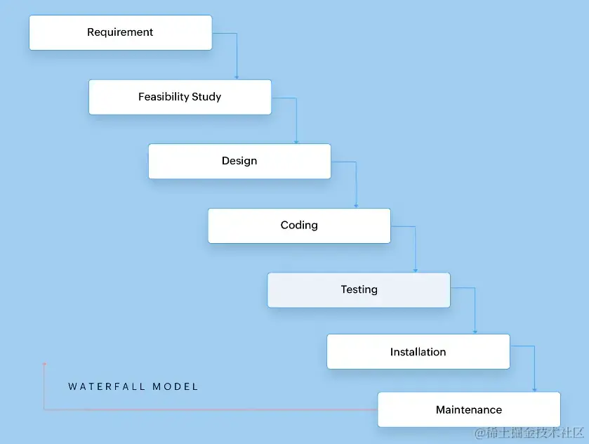瀑布模型是一个线性且易于理解的流程。顾名思义,这个模型从一个阶段过渡到另一个阶段,就像瀑布一样。一个阶段的输出进入下一个阶段,在大多数情况下,如果没有完成上一个阶段,就无法进入下一个阶段。这也意味着软件只有在整个流程结束后才能使用,甚至是进行测试。瀑布模型适合那些在要求和输出方面定义明确,且时间跨度较短的项目。