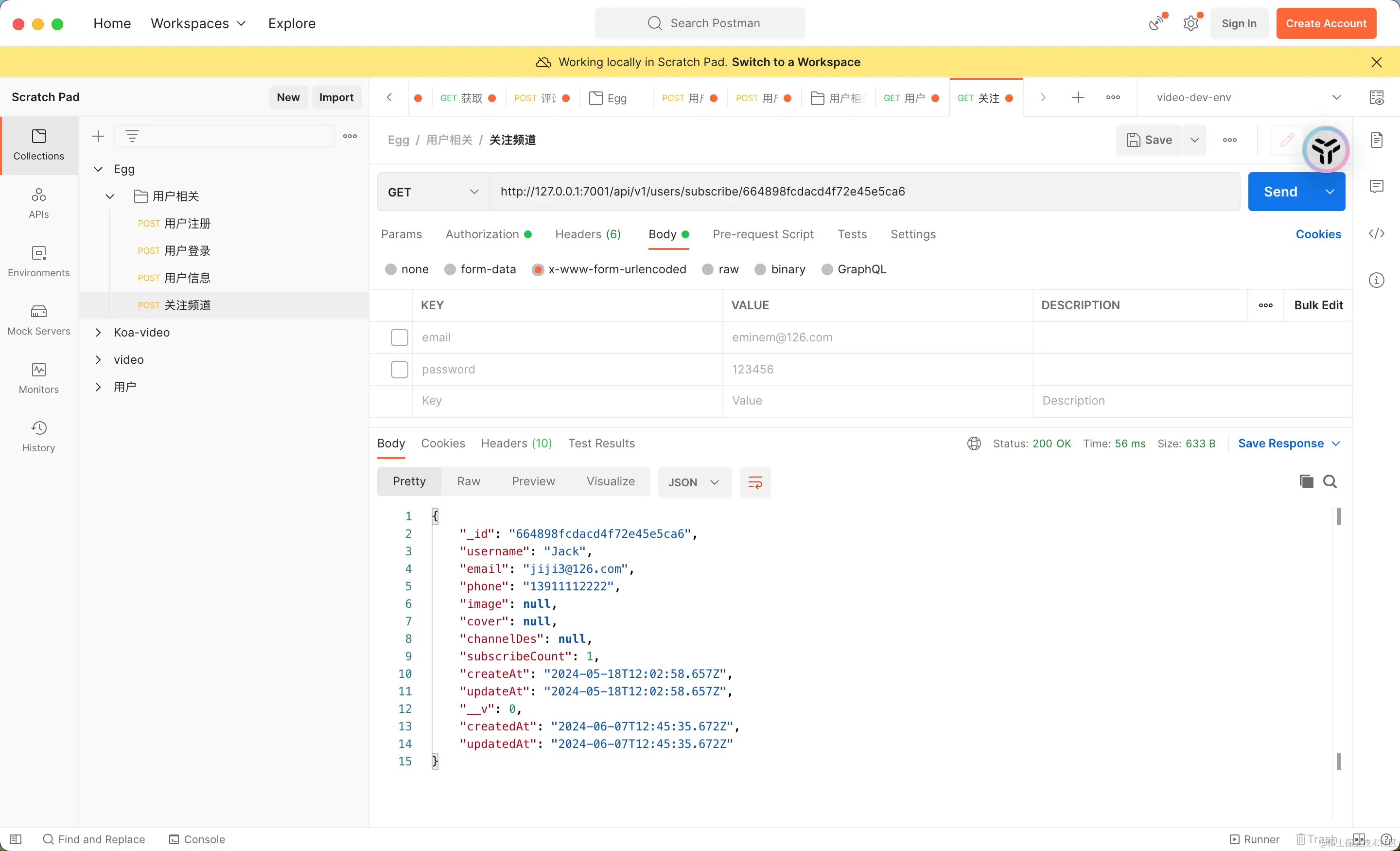 http://localhost:7001/api/v1/users/subscribe/{subscribeId}。 - 检查返回的数据,验证用户关注功能是否正确。