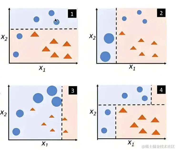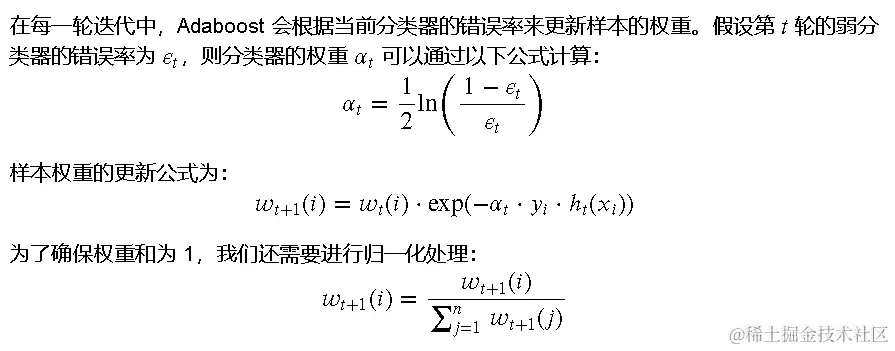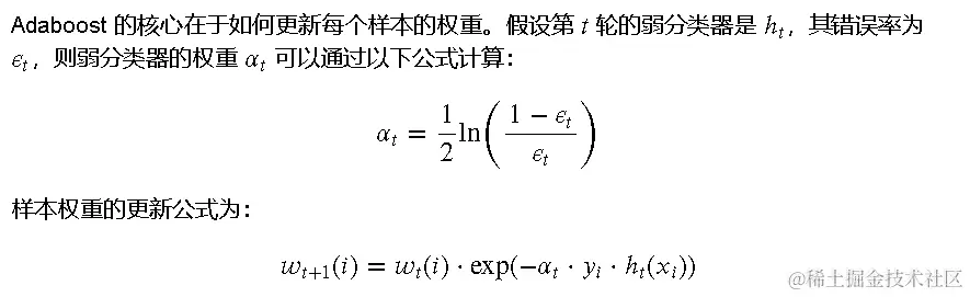 Adaboost 是一种集成学习方法,集成了多个弱分类器来提高整体的分类性能。每个弱分类器的权重根据其分类准确度进行调整。