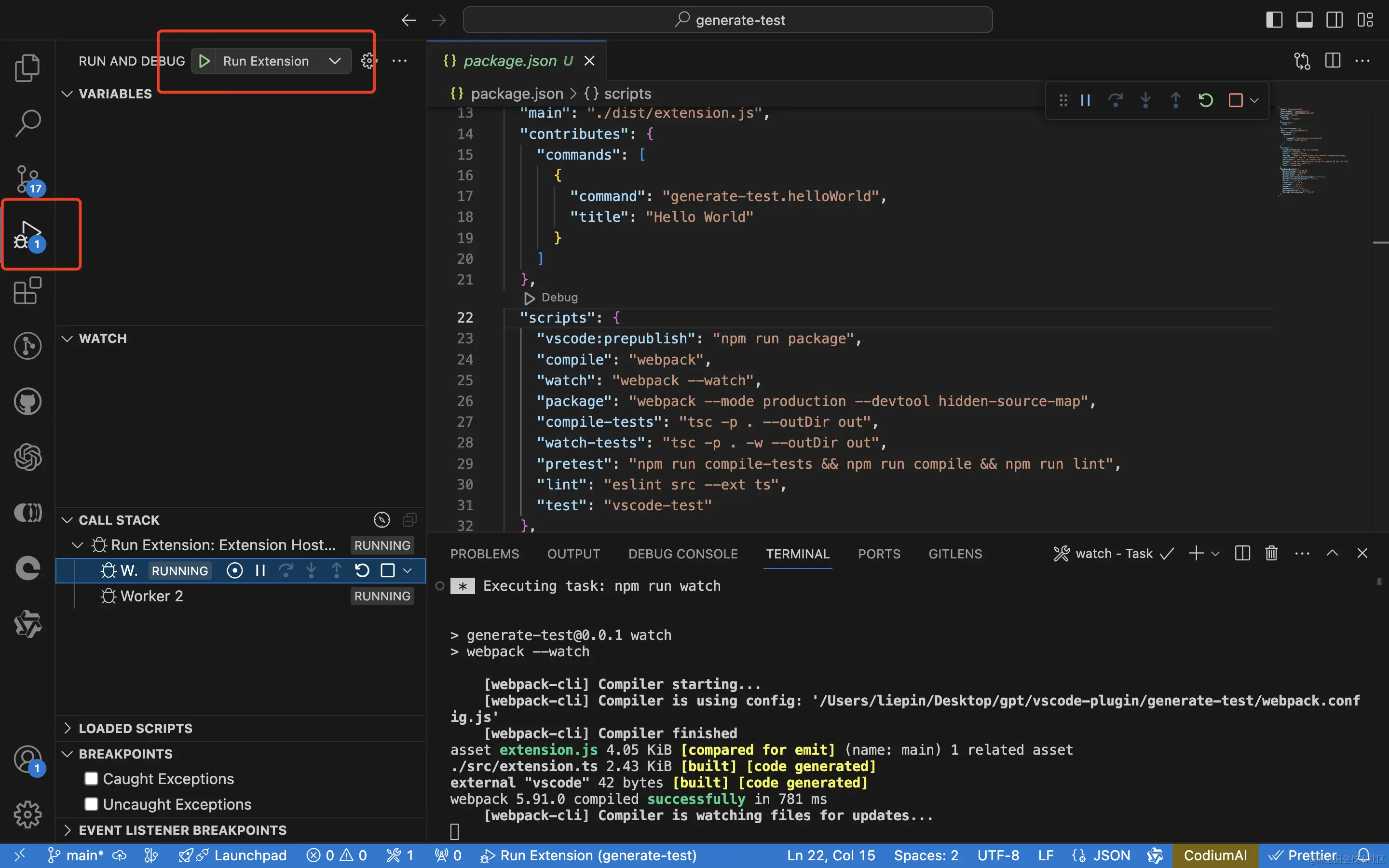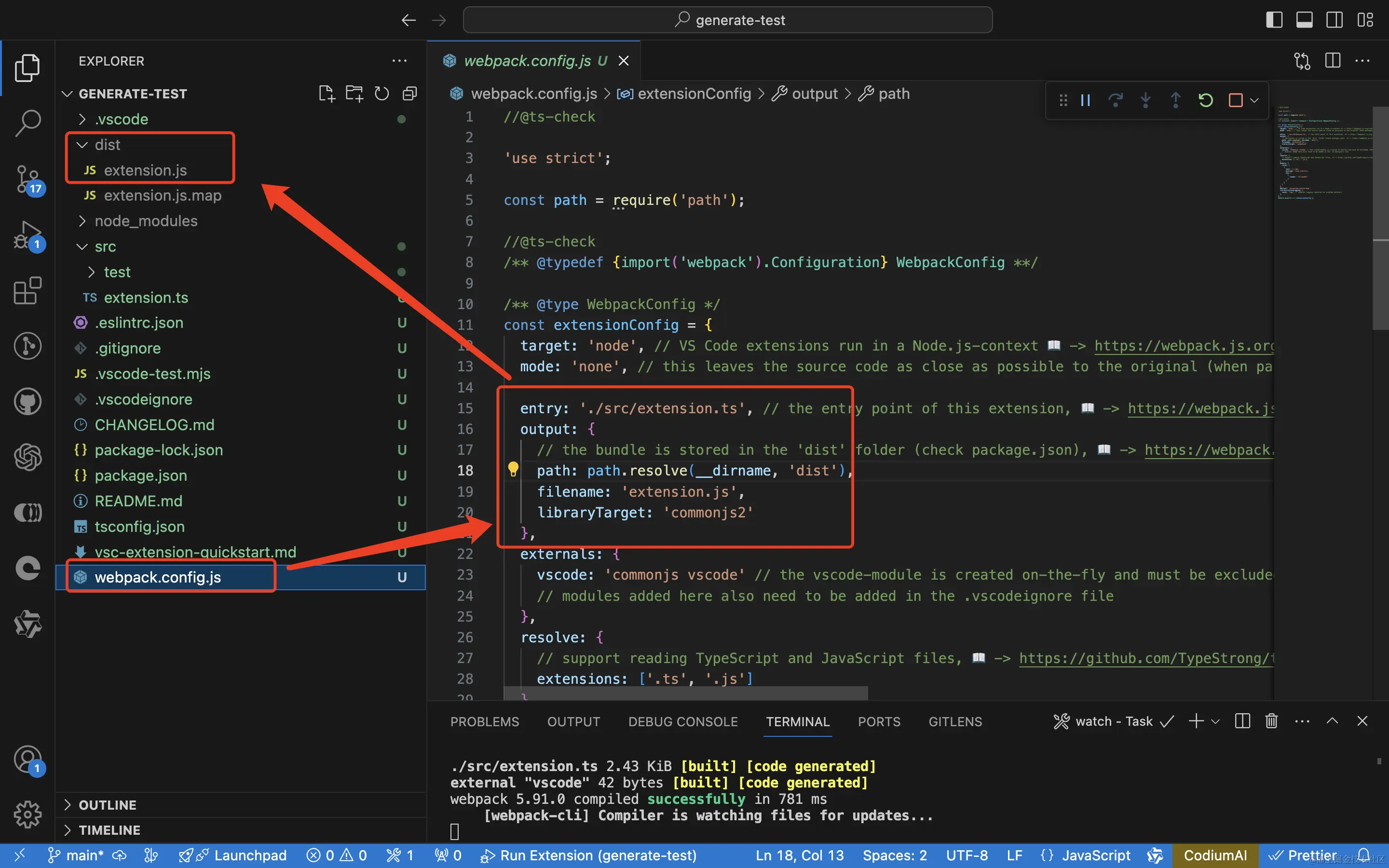 webpack.config.js文件中,配置了入口是src目录下的extension文件,打包后会生成dist/extension.js;