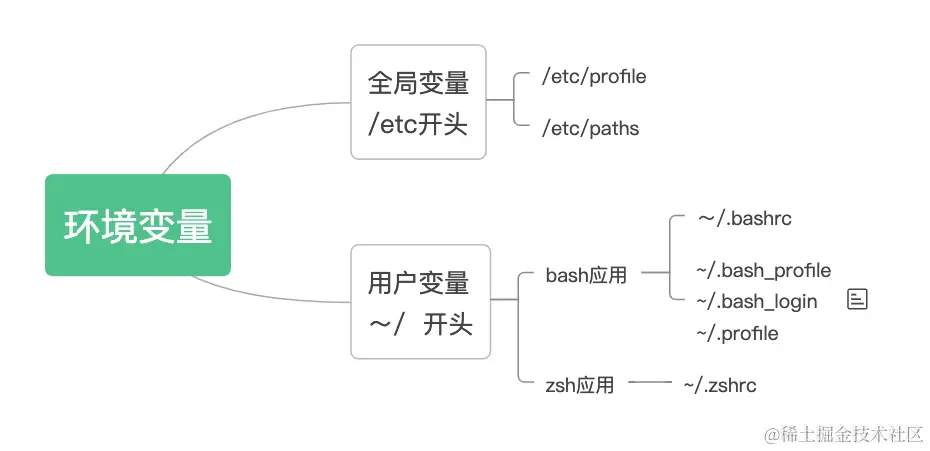 额外知识点:环境变量分为全局变量和用户变量;用户变量的配置文件由具体shell应用决定。