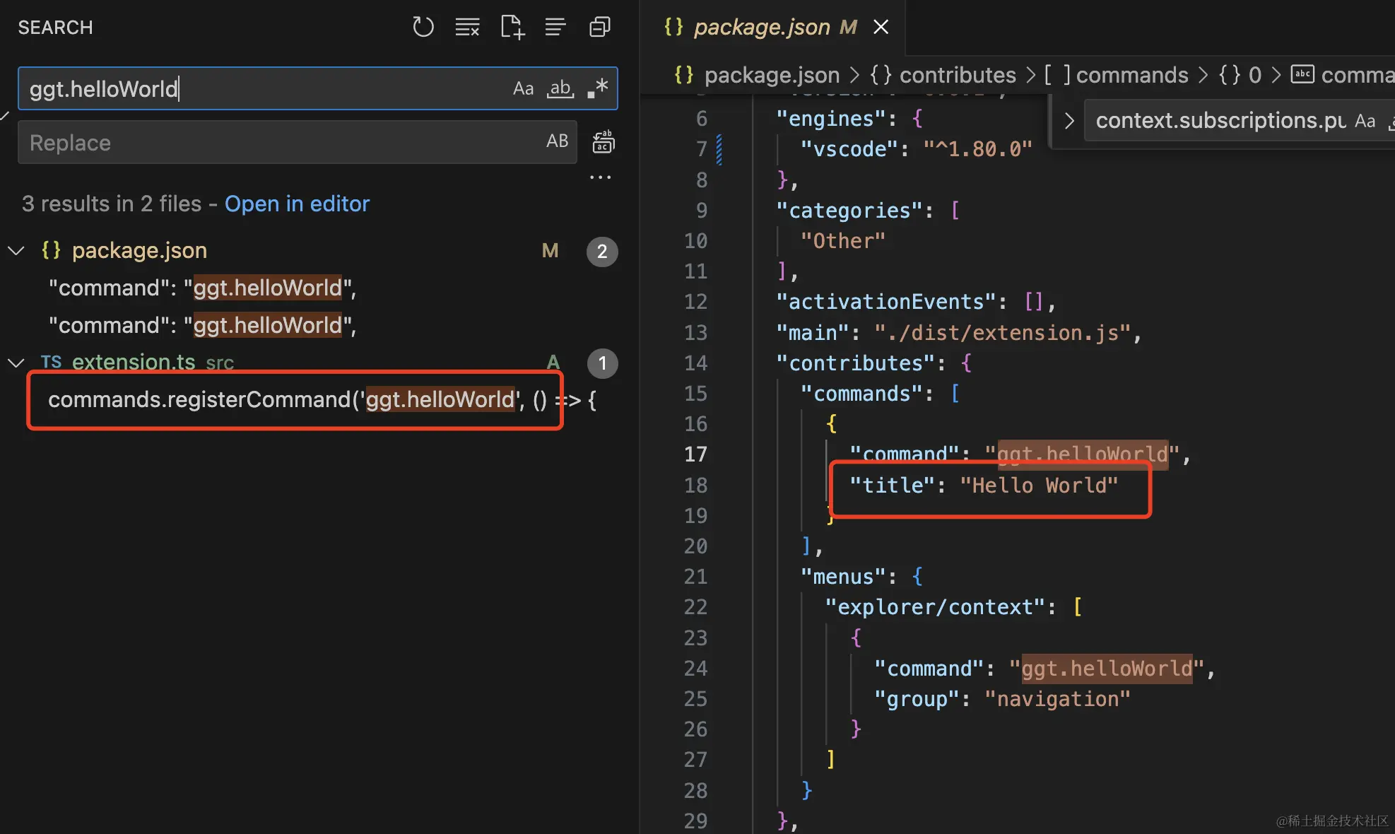 vscode.commands.registerCommand('ggt.helloWorld', () => {...})