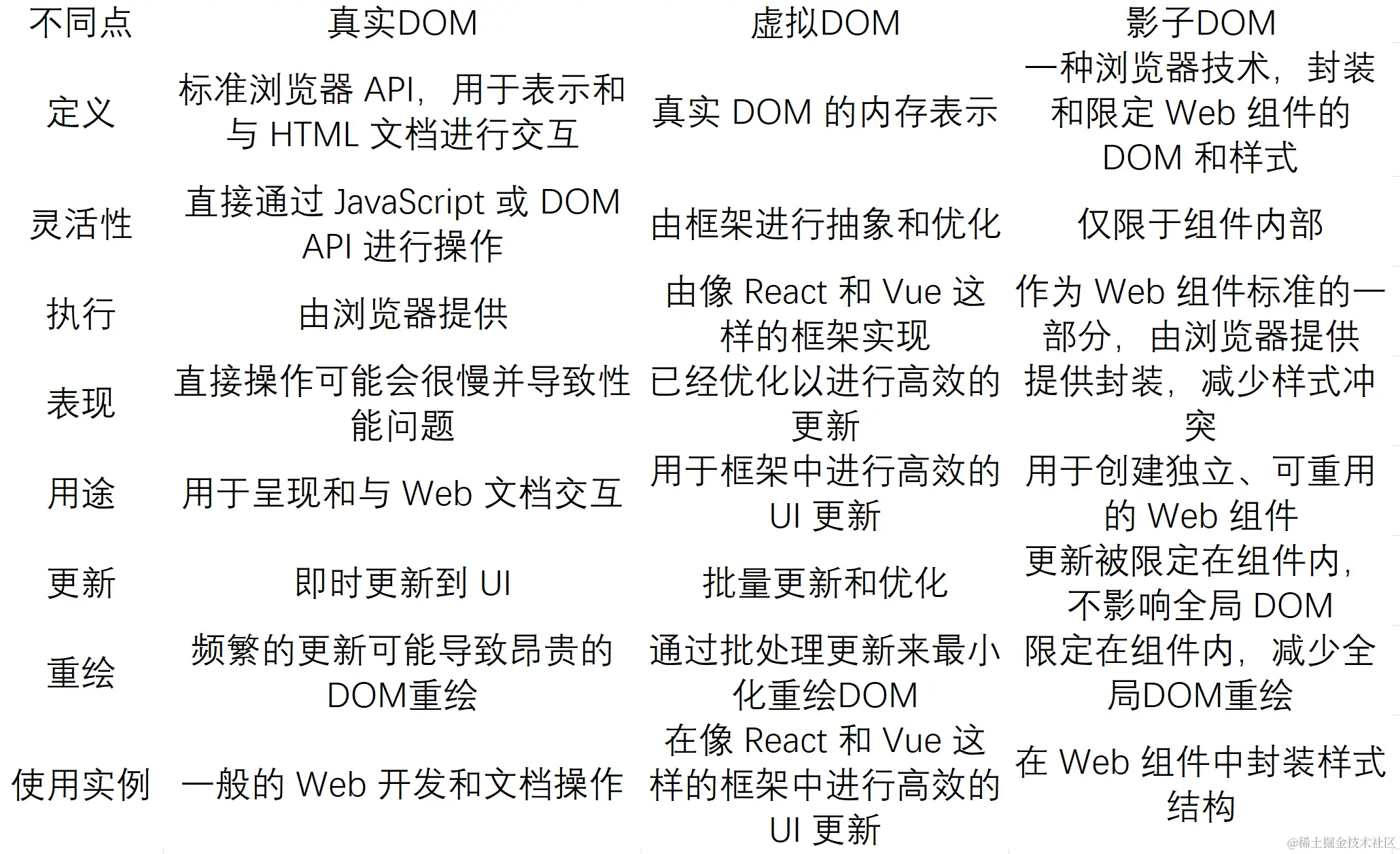 既然我们已经确定了虚拟 DOM、影子 DOM 和真实 DOM 是不同的。我们来看看三者之间的区别,详情见下面的表格截图: