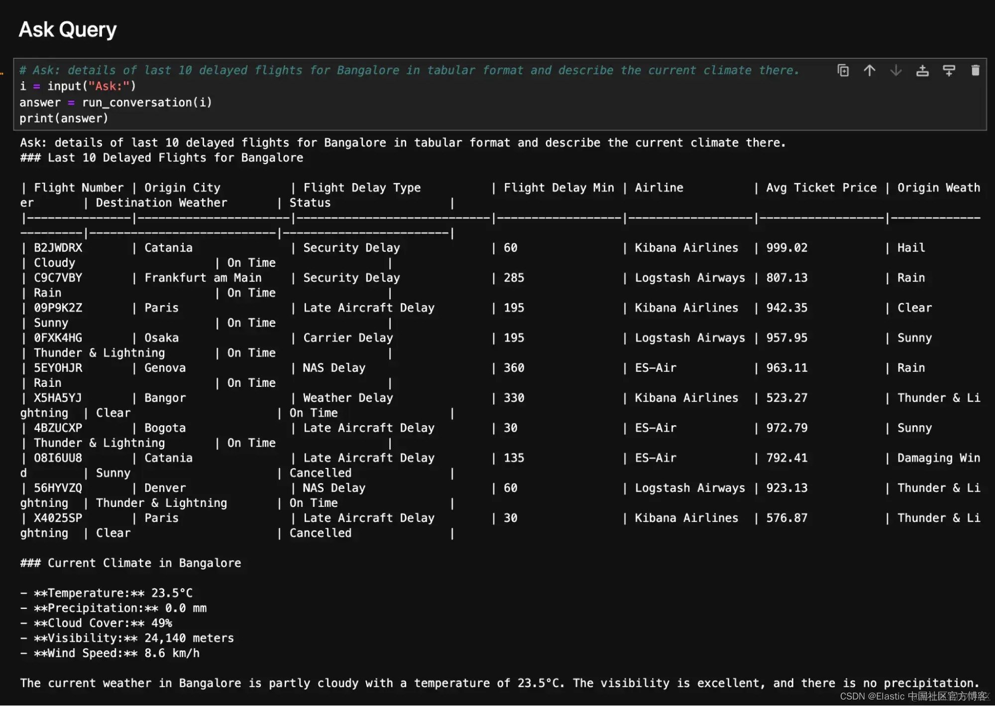 此函数将接受 nl_query 参数作为自然语言(英语)的字符串,并以字符串形式返回 json elasticsearch 响应。它将对 kibana_sample_data_flights 索引执行所有查询,该索引保存所有航班相关数据。