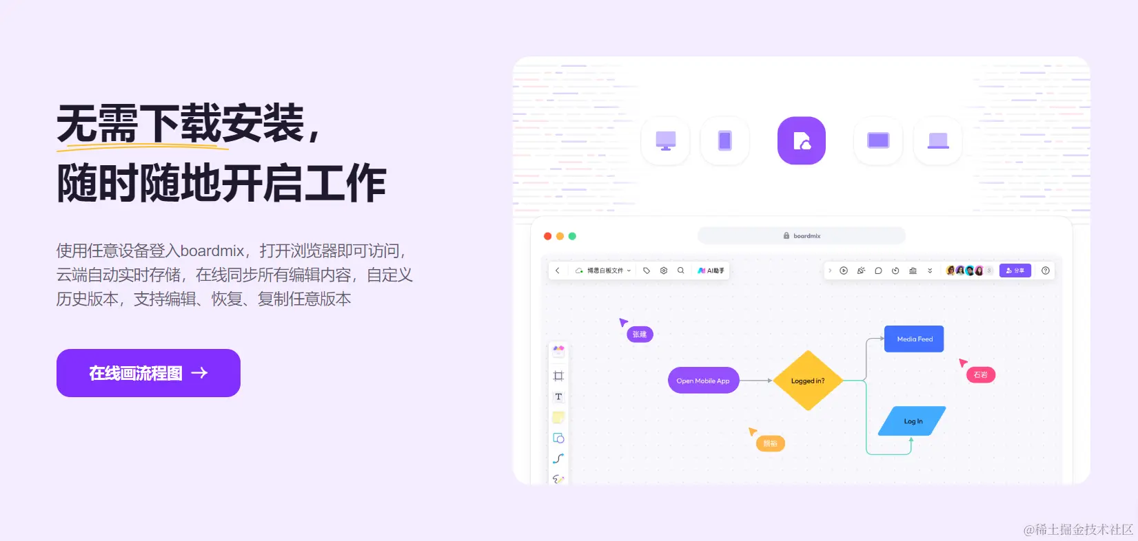 boardmix 博思白板是一款跨平台的在线绘图工具。它基于 Web 运行,无需安装,你可以通过任何设备上的浏览器访问并绘制 UML 图。无论你使用 Windows、macOS、Linux 系统还是平板设备,都可以轻松制作和编辑 UML 图。你的绘图体验将更加灵活和便捷。