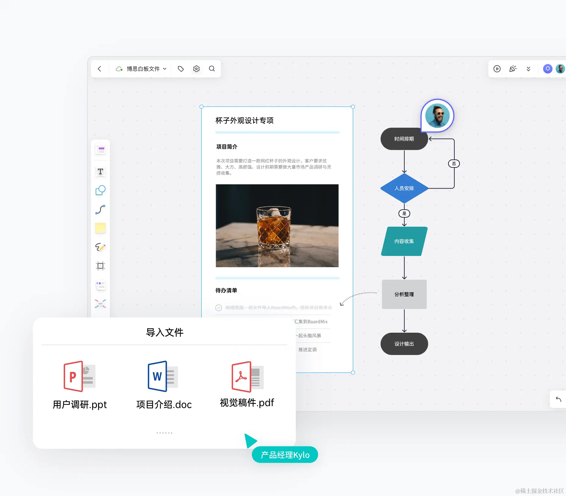 你可以与团队实时协作,并插入图像、视频、绘图、文档、网站卡片或任何其他媒体,以清晰传达你的意图。