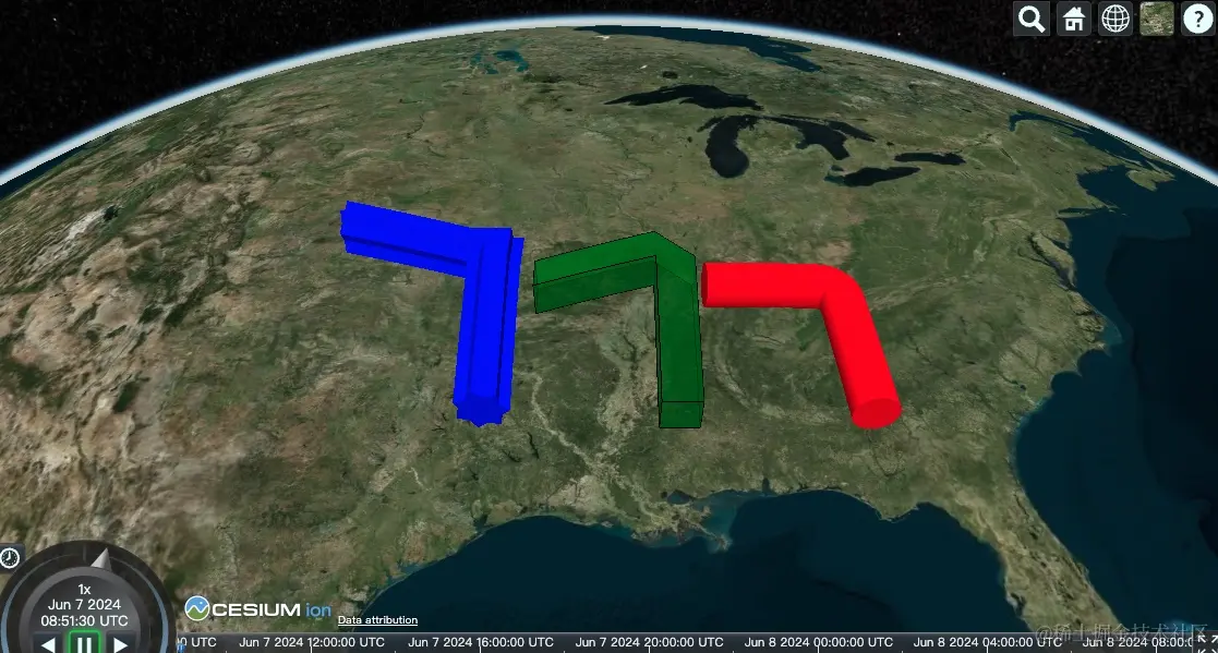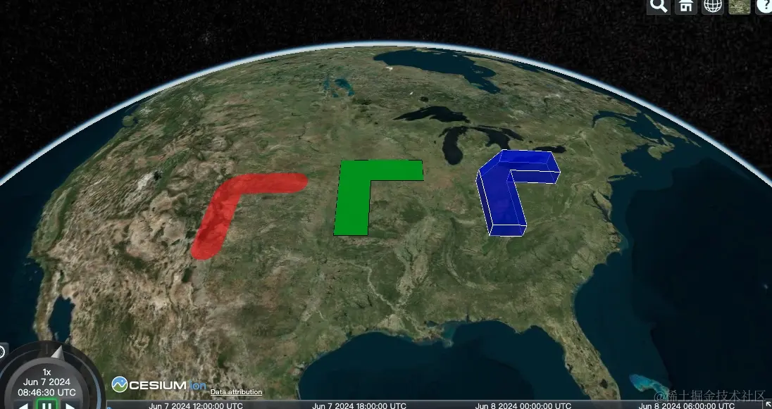 包括 corridor(走廊)、ellipse(椭圆)、polygon(多边形)和 rectangles(矩形)在内的平面形状可以被放置在特定的高度上,或者可以沿高度方向拉伸成为立体形状。不论是处于平面状态还是立体状态,这些形状都将遵循 WGS84 椭球的曲率。这意味着它们会适应地球表面的弯曲,保持与地球表面一致的形态。