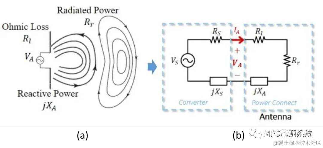 图1为双有源桥变换器的拓扑以及实物图。从图1中可见,输入和输出各有一段导线。根据我们之前的分享可知,变换器的输入与输出线相当于一对双极天线(Dipole Antenna) 。这个高频的共模电压会在输入、输出线上激励出高频的共模电流IA,并以电磁场的形式向外辐射能量。如图2(a)所示,天线的能量可以看成以下几部分:一部分在两极之间相互转换,并不辐射到空间去,这部分无功对应的阻抗可以用jXA表示;一部分是发射出去的能量,用Rr来表示;最后一部分是天线上的电流在其本身电阻上产生的损耗,以Rl表示。而变换器的模型则可以通过一个等效噪声源VS和源阻抗(实部RS和虚部XS) 来表示。因此,一个通用的辐射EMI模型即可通过图2(b)的形式来表示。