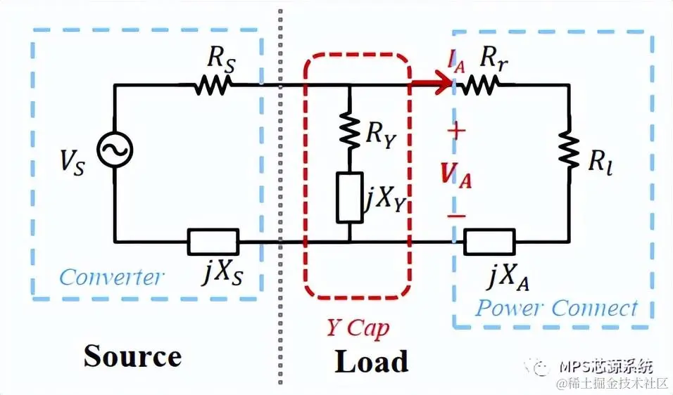 另外一种常见的抑制EMI的手段时在输入和输出直流母线上跨接一个Y电容。用同样的分析手段,我们可以将其等效为电阻(RY)与电抗(XY)的串联形式,如图8所示。