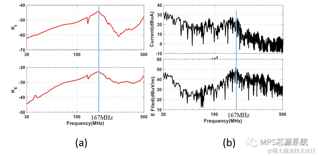 图4所示为KI和KE的曲线,以及共模电流和辐射强度的实测值。从图4中可以看到,在167MHz处,由于XS和XA抵消且RS + RA较小,我们确实可以观察到一个尖峰。且实验结果也可以验证这一点。