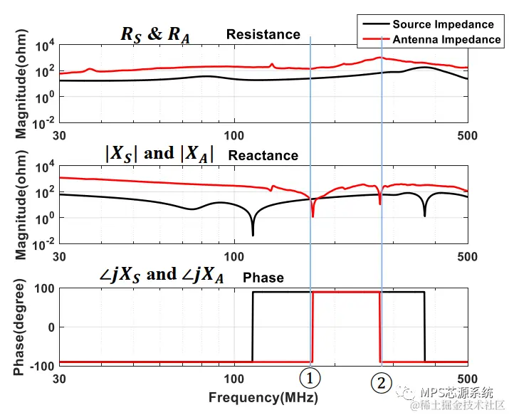 图3为双有源桥变换器源阻抗和天线阻抗的测量结果。我们可以看到XS和XA的曲线一共发生了四次交越,但只有当它们相位相反时,才意味着这两部分是抵消的(①和②处)。另外,由于在②处,RA有近千欧姆,因此此时不太会出现尖峰;相比之下,①处的RA仅约100欧姆。①处的频率约为167MHz。