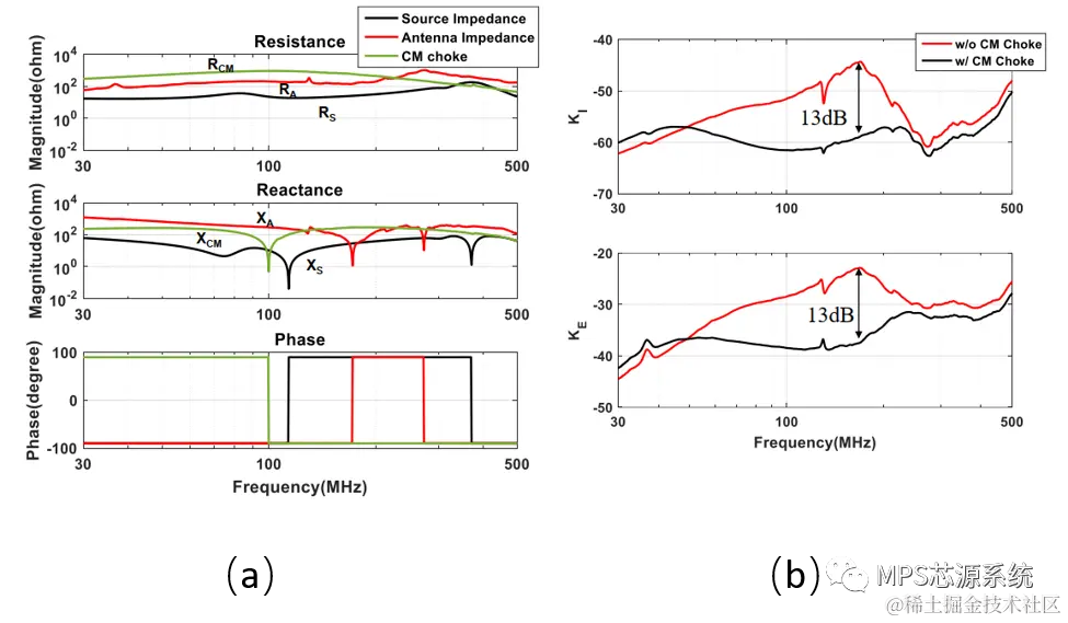 图6 (a)共模电感阻抗曲线 (b)有无共模电感时的KI和KE的比较。