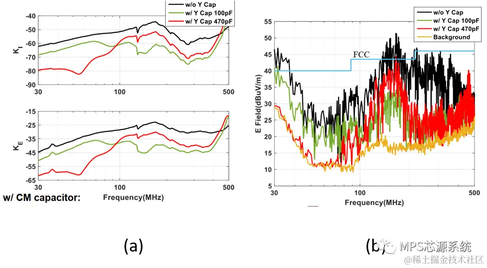 图10 (a)有、无Y电容时的KI和KE的比较(b)有、无Y电容时的辐射EMI对比