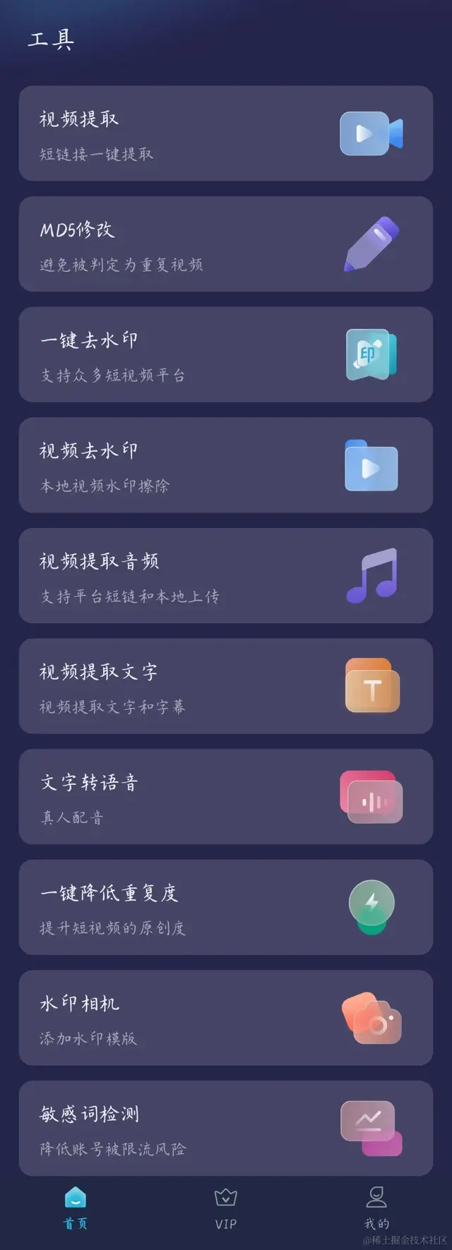 (2)软件功能十分全面且强大,涵盖了:视频提取、MD5修改、一键去水印、视频去水印、视频提取音频、视频提取文字、文字转语音、一键降重、水印相机、敏感词检测。