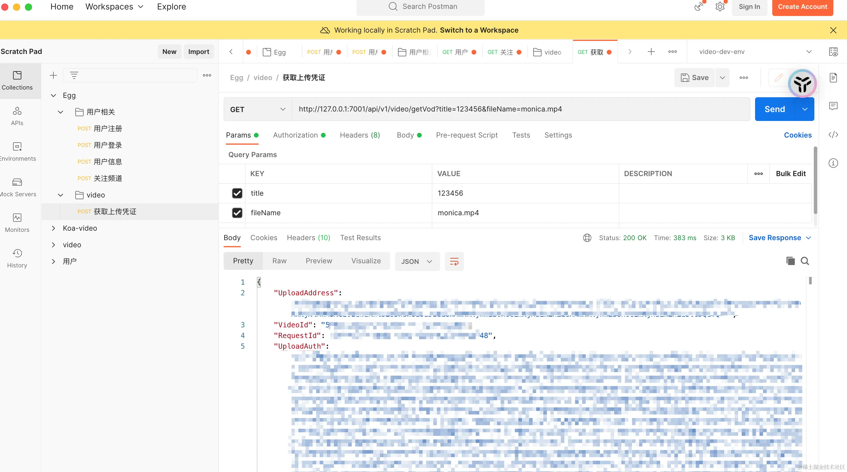 配置完成后,我们可以使用Postman来验证接口是否正常工作。发送GET请求到/video/getVod,并在请求参数中包含title和fileName。如果配置正确,你将会在阿里云后台看到视频上传任务已创建,并成功获取上传凭证。