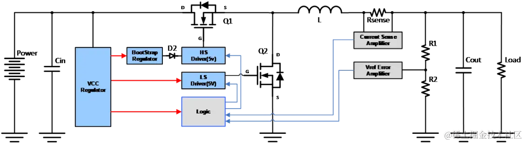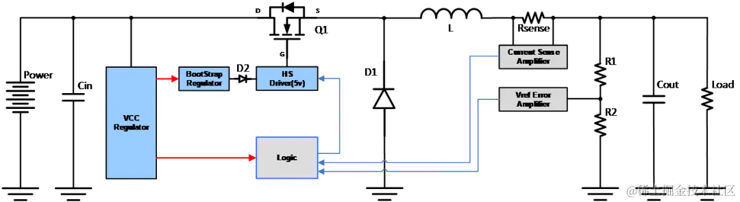 开关管N MOSFET Q1的驱动电路由控制芯片中的VCC转换器供电,VCC转换器通常为线性稳压器,存在较大效率损失,同时由于上管源极电压浮动,需要自举电路提供浮动驱动电压,此处存在一定效率损失。