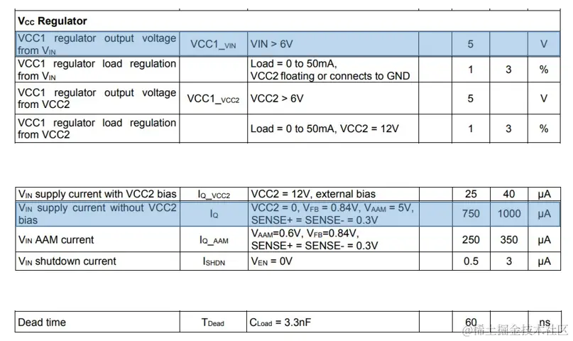 从手册中找到计算所需的栅极驱动电源电压、芯片静态电流、死区时间。