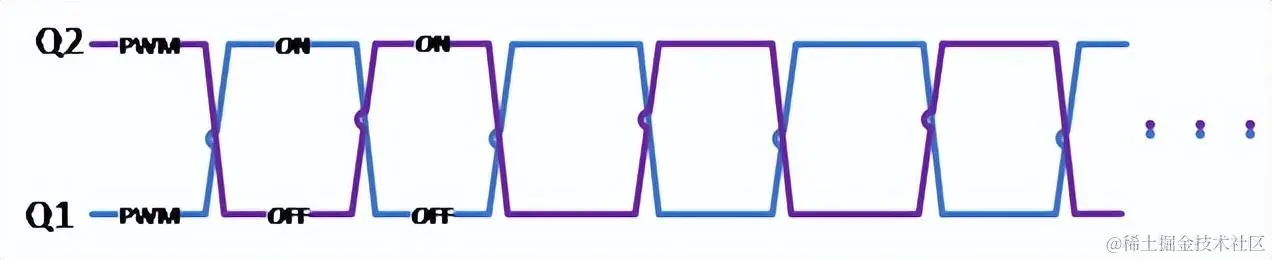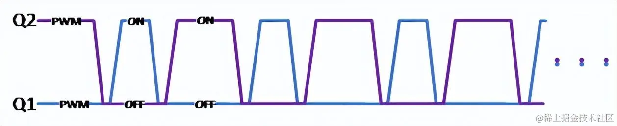 为了完全错开两管的开关过程,便在驱动逻辑上增加了死区时间。在死区时间内,两个MOSFET均关闭,电感电流不能突变,便只得从续流MOSFET Q2的体二极管中流过,但由于体二极管正向导通压降的存在,也形成了一定的导通损耗。