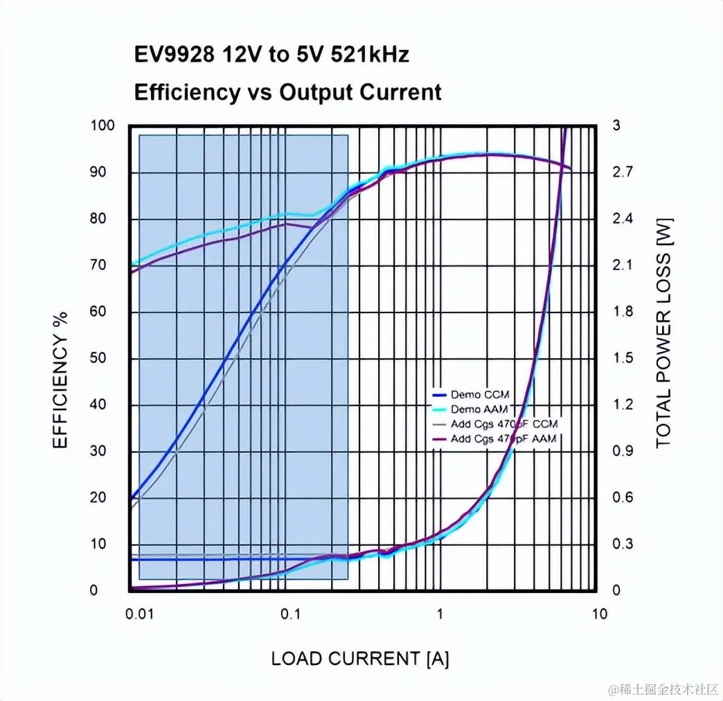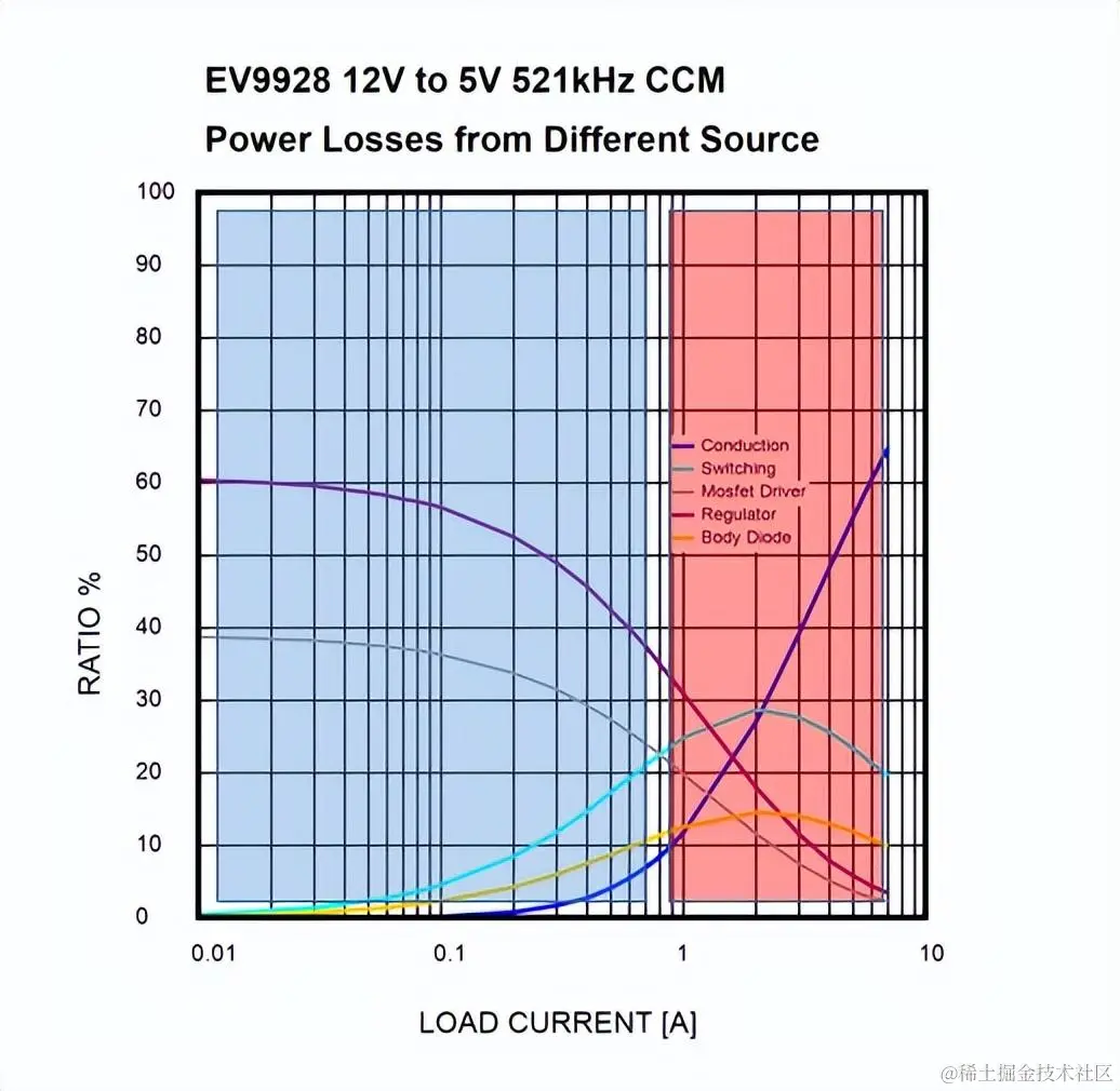 可以发现轻载时的损耗主要来源于芯片内部转换电路损耗以及MOSFET驱动损耗,而重载时主要来自于MOSFET、电感、采样电阻等的导通损耗、以及MOSFET的开关损耗和死区时间内下管体二极管续流时的损耗。