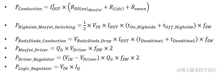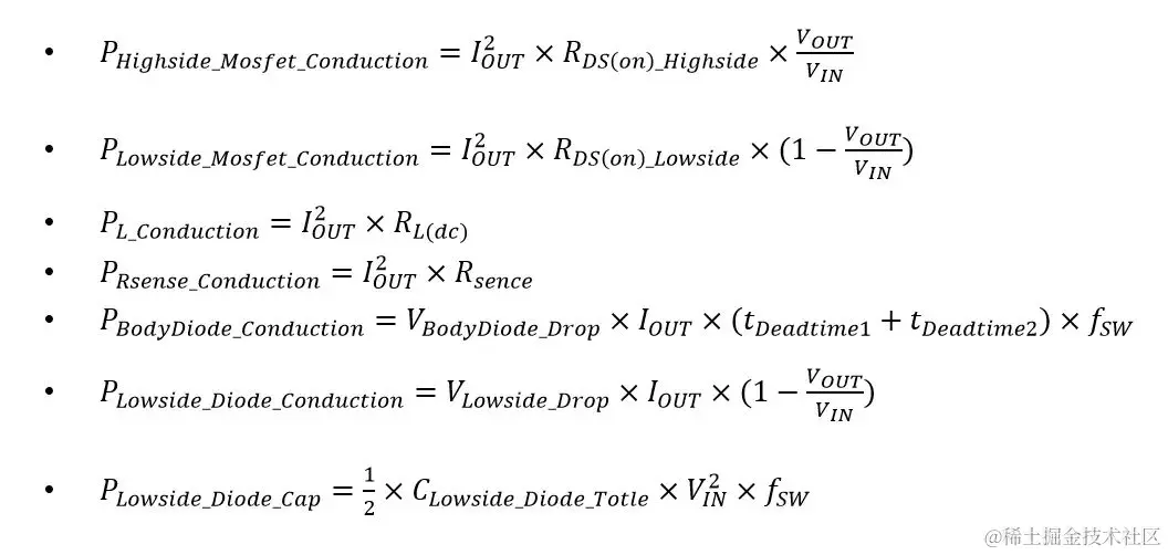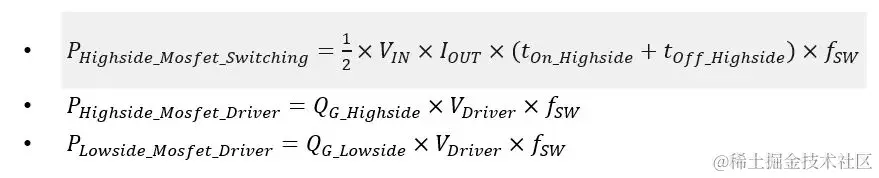 计算损耗所需要的公式如下,由于上下管 MOSFET 参数一致,可以对计算公式进行化简: