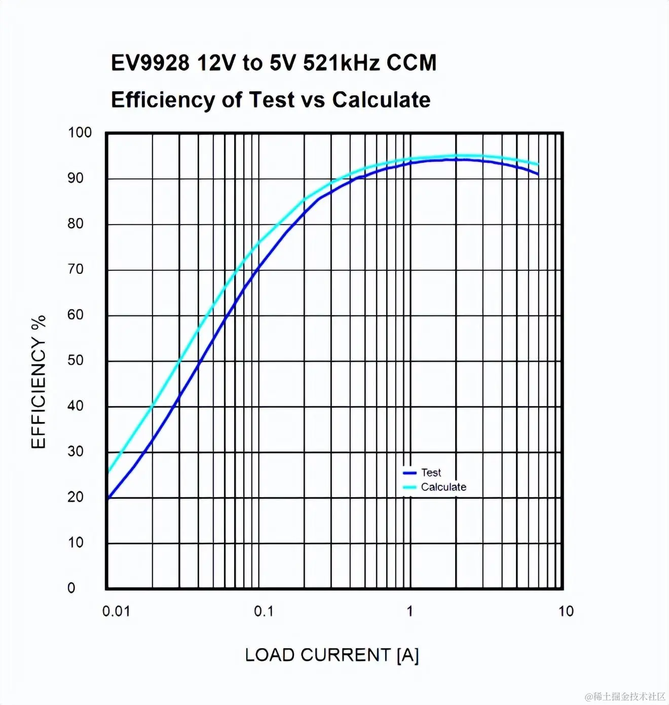 MP9928 评估板的效率计算结果与真实条件下的测试结果对比如下: