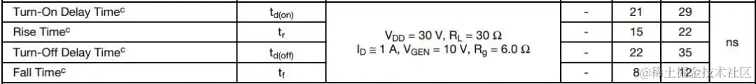 MOSFET实际的开关时间需要在电路中测试,此处选用MOSFET手册中数据作为参考。