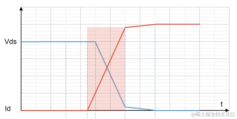 导通期间,MOSFET 漏极电压 Vds与漏极电流 Id重合,产生开通损耗。