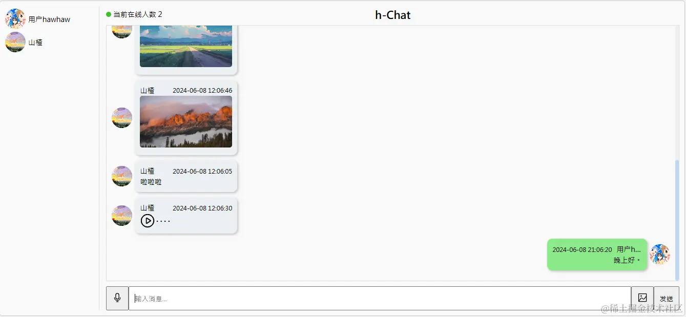实现了登录之后多人聊天,加载历史记录,可发送语音、图片、文字等。使用mysql进行聊天数据存储,腾讯云COS存储桶上传语音、图片文件。某些功能可以有bug,如发送语音等,刚接触的MediaRecorder API浏览器录音功能,还不熟悉,照搬来用的。